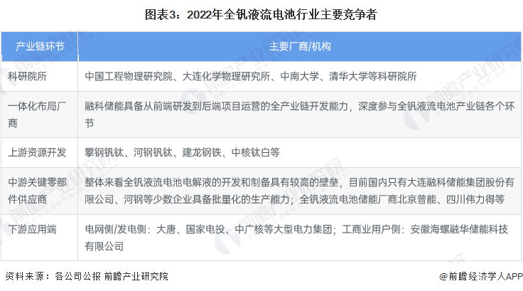 全体来看当时全钒液流电池储能仍处于商业化运营初期,商场参与者最重要的包含科研院所、零部件供货商、一体化布局厂商等,职业竞赛状况较为适中。