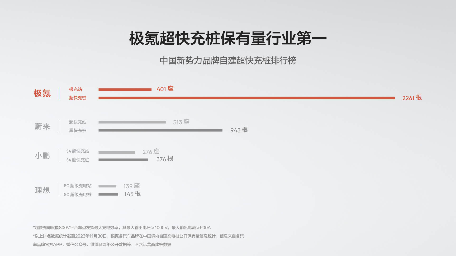 作为超快充的引领者,极氪对于新能源核心科技的引领,除了800V的车,800V的电,还有完善的800V超快充网络;从布局、技术和体验三个方面,打造出最为完善的极充补能体系,让用户彻底告别里程焦虑。截至11月30日,极氪累计建成401座极充站,覆盖全国100座城市,提供2261个极充桩,每个极充桩的充电功率都在360 kW以上。2024年,极氪极充站总数预计将达到1000站;到2026年,极充桩总数预计将达到10000根,实现“千站万桩”的创想。