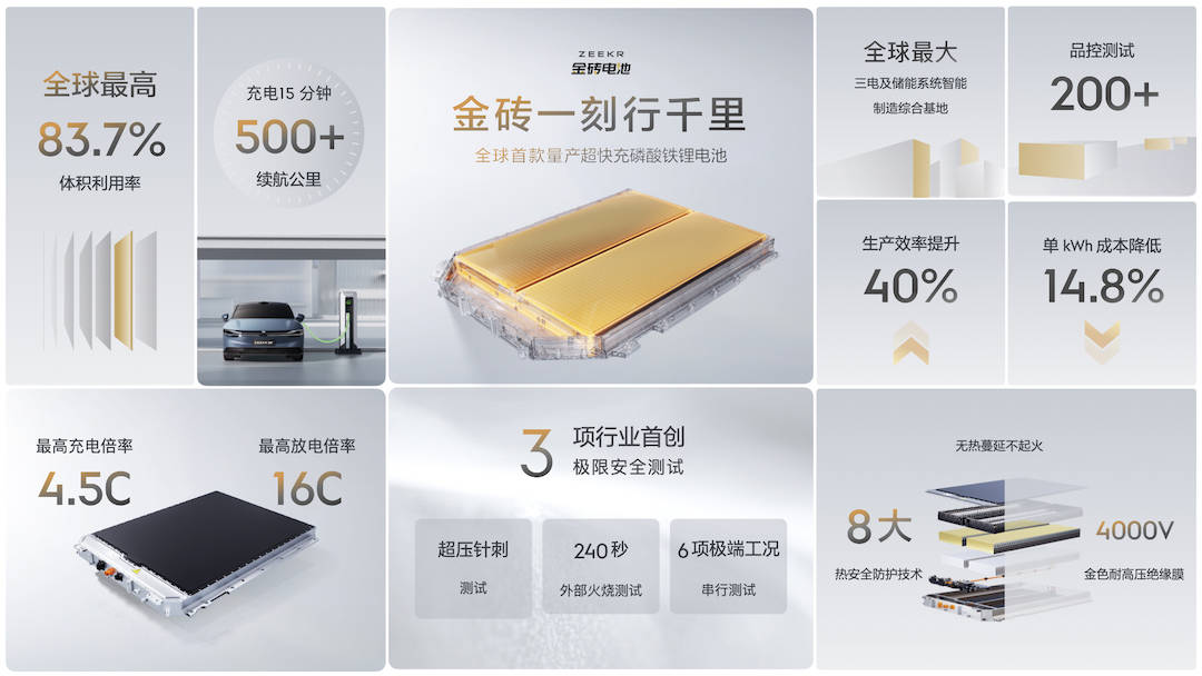 12月14日,极氪智能科技正式召开极氪能源日2023,在发布会上正式对外发布全球首款量产800V磷酸铁锂超快充电池——金砖电池。金砖电池体积利用率达83.7%,是目前全球体积利用率最高的动力电池,全球量产充电速度最快的800V磷酸铁锂电池,以及全球最安全的动力电池,将在安全、体验和成本上全面引领800V时代。值得一提的是,金砖电池的生产效率提升超过40%,较同等性能的三元锂电池,金砖电池每度电能够更好的降低14.8%的成本。目前金砖电池已经正式量产下线上首发搭载。