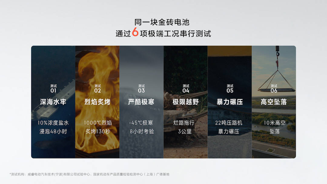 第三个是把难度拉满的「6项极端工况串行测试」,同一块金砖电池连续进行浸水、火烧、冰冻、拖行,再加上碾压、高坠6大极限测试,全行业绝无仅有的测试标准和难度,即便经历这样的地狱之旅,金砖电池依然不起火,无爆炸,保持“金身不破”。